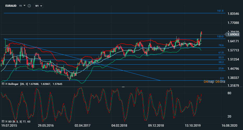 A heti EURAUD igen hirtelen kitört, de némileg alábbhagyott a juró vétele az aud-dal szemben. Heti szinten a FIBO 100%-os szint fölé került az árfolyam.