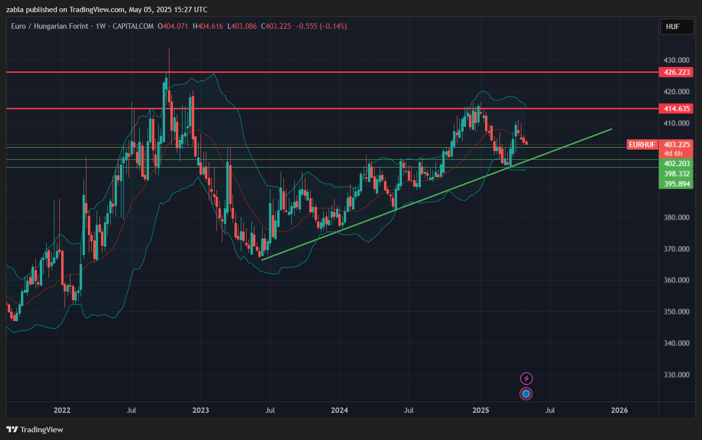 EURHUF középtávú erősödés várható, ami forint gyengülést mutat. Az eurhuf árfolyam stabilitását jelenleg a viszonylag nyugodt nemzetközi környezet és a vámháborús feszültségek enyhülése támogatja. A hazai makrogazdasági adatok (például a BMI romlása) nem okoztak jelentős elmozdulást, az inflációs adatokat pedig kiemelten figyeli a piac. A legtöbb elemző szerint májusban továbbra is a 404-405-ös sávban maradhat az árfolyam, jelentősebb elmozdulás csak újabb külső vagy belső gazdasági sokk esetén várható. De ezt remekül mutatj a heti eurhuf grafikon is, érdemes figyelned a piros és zöld támasz és ellenállási szinteket. Az elemzők 2025 egészére a 409–425 forintos sávot tartják reálisnak az euróval szemben, az év közepén inkább a sáv alsó, év végén a felső részére számítanak. A forint tartós, 400 alatti árfolyamára egyre kevésbé lehet számítani, a fundamentumok alapján a 405 körüli szint lehet az éves átlag.