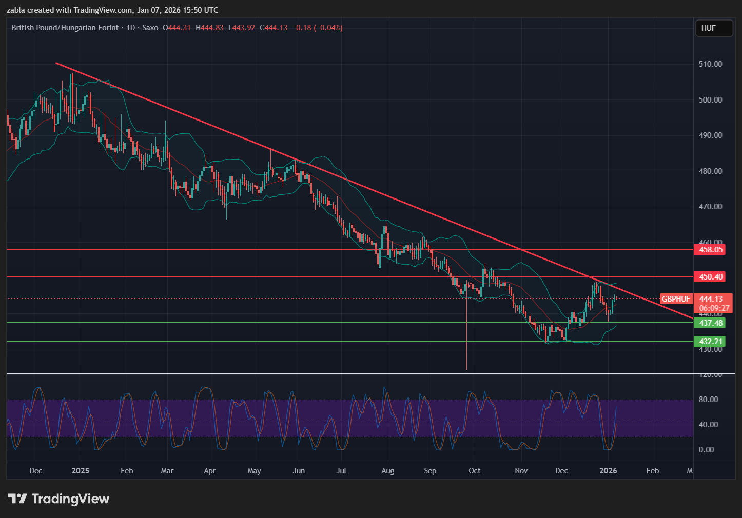 GBPHUF korlátozott emelkedés várható januárban. A GBPHUF árfolyam január elején 440-444 HUF körül mozgott, enyhe emelkedéssel a januári mélypontról (440,40 HUF, jan. 2.) a csúcsig (444,41 HUF, jan. 6.). Technikai szempontból óvatosan bullish (bika) a kép, mivel az árfolyam a 439,97-es pivot fölött áll, RSI 58,46-nál momentumot jelez, de Stochastic túladott zónában van (9 napos 14,97%).