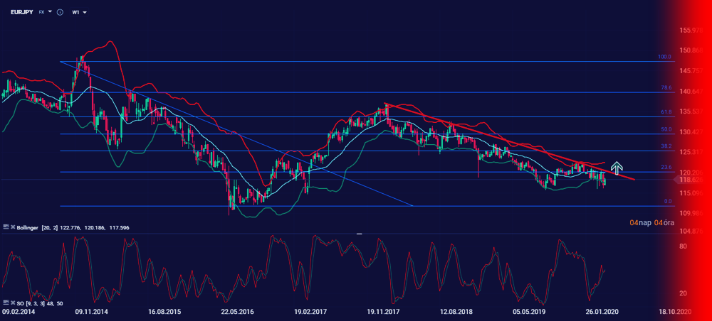 A heti eurjpy árfolyam igen erősen juró vételeket mutat. A ferde piros ellenállás igen döntő lehet az elkövetkező napokban, hetekben.