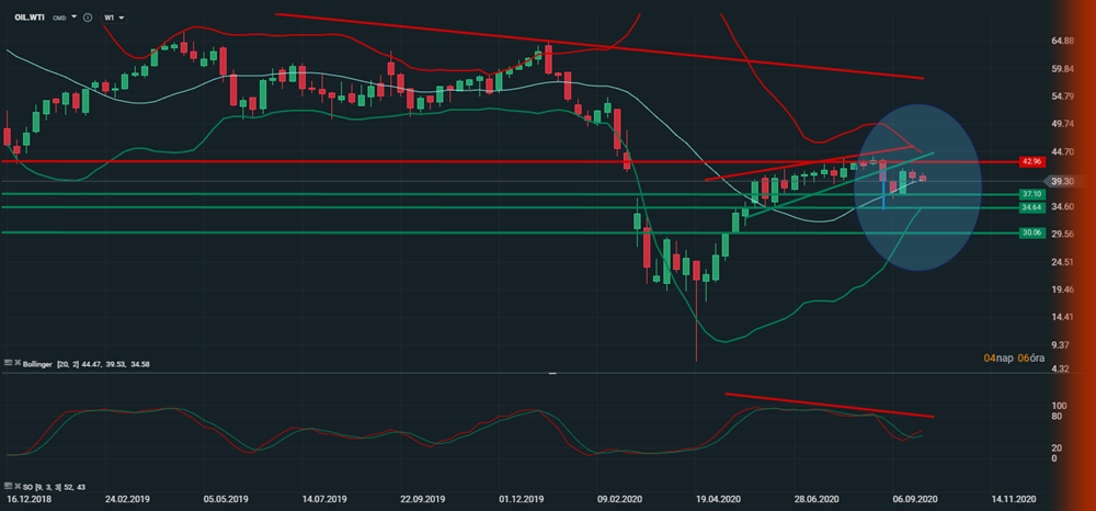 A heti WTI USA olaj folytatja a csökkenést, mivel megtörtént a technikai visszatesztelés. Így a fontosabb szintek a ferde zöld támaszok, amit a heti grafikon is remekül ábrázol.