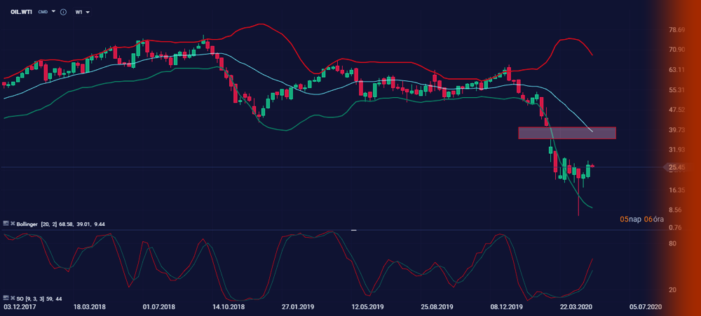 A heti OIL grafikon némi megtorpanást mutat. De ez nem is jelent semmit, mivel az olaj további emelkedése attól függ, hogy milyen ütemben nyitnak a gazdaságok. Azaz mennyire lehet spekulálni az olaj iránti keresletből fakadó emelkedésre.