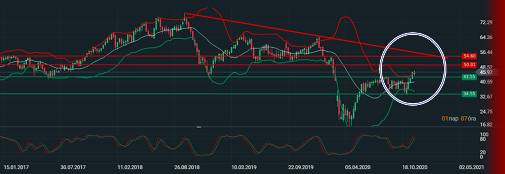 Nagyon szépen alakul az olajos árfolyam, ami lassan elérhet az 50 $-os szintet. De természetesen lehetnek hullámvasutak, de közepes (1-2 hónap) távon nézve igen érdekesek lehetnek a vízszintes piros ellenállások vonalai. Amik 50$ fölé is vihetik az árfolyamot, teljesen a ferde piros ellenállásig.
