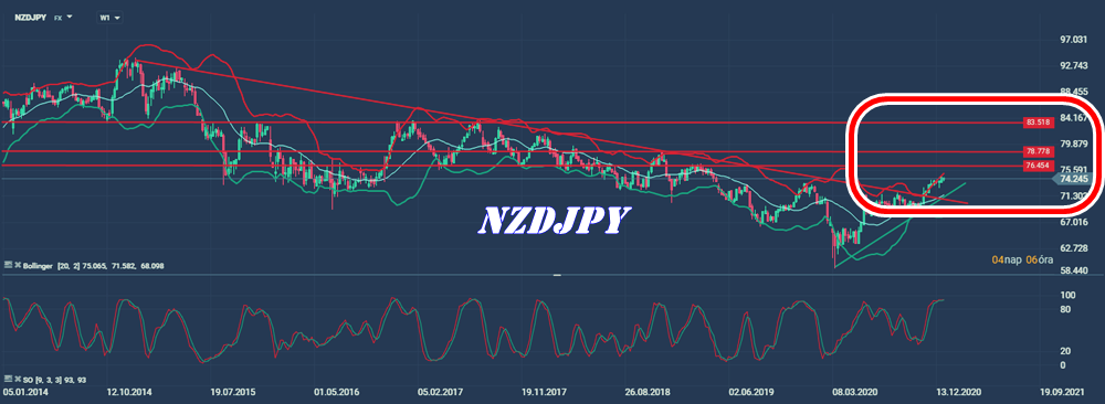 Mivel: az NZDJPY november és december második felében oldalazott, azonban a devizapár a közelmúltban áttörte és újra tesztelte a fő ellenállást 74.00-nál.